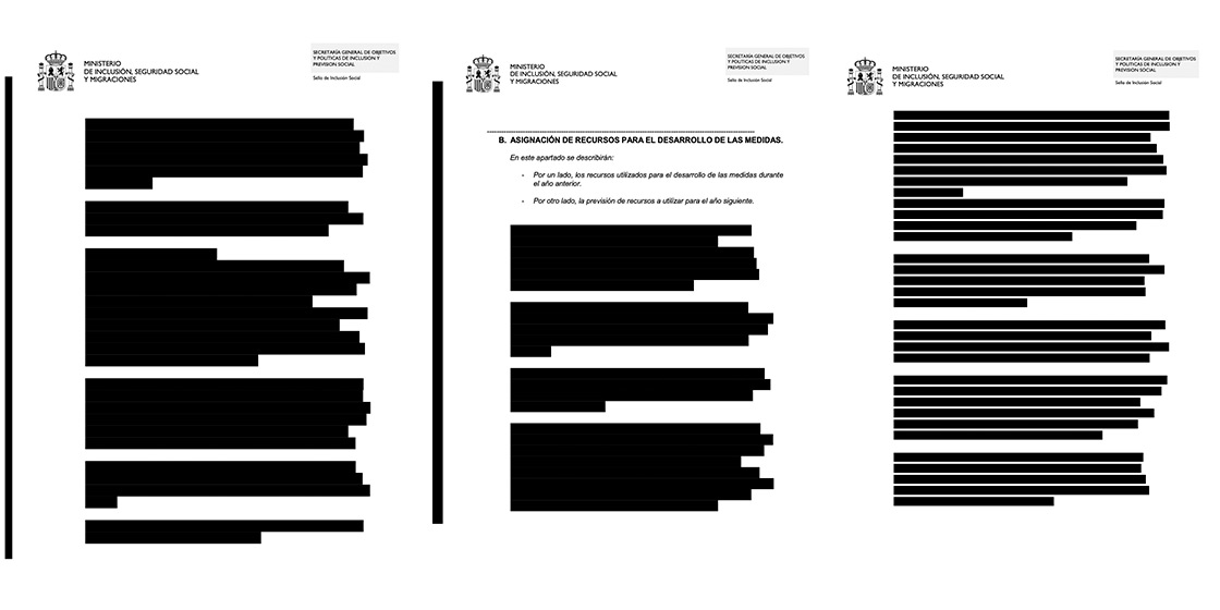 Civio solicitó al Ministerio de Inclusión, Seguridad Social y Migraciones a través de la Ley de Transparencia los informes anuales que les habían enviado las entidades con el Sello de Inclusión Social. El Ministerio dio trámite de audiencia a las tres entidades y nos facilitó los documentos anonimizados según las alegaciones de las mismas. El resultado: documentos de una decena de páginas con prácticamente toda la información anonimizada.